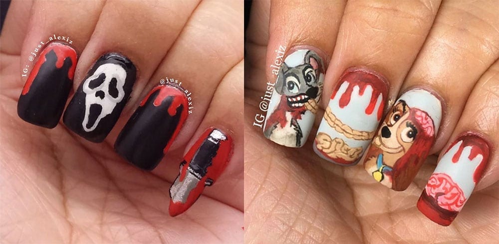If you loved the IT nails then you will scream over this next nail art. Literally Scream, because the next nails are inspired by the famed horror movie Scream. These nails date back to 1996 when the horror movie Scream hit the screens. Everyone wanted to dress up in black with a Scream face for Halloween in the 1990’s and it became a huge horror icon. The look is simple black nails with some blood and of course, the iconic Scream faces. This slasher movie was inspired by the 1978 movie Halloween, but Scream became so iconic that most people don’t even think about the 1978 movie anymore. Your nails will not only be horrifying, but iconic! This look is again by Instagrammer Just_Alexiz and is an easy twist on some screamingly beautiful nails.
